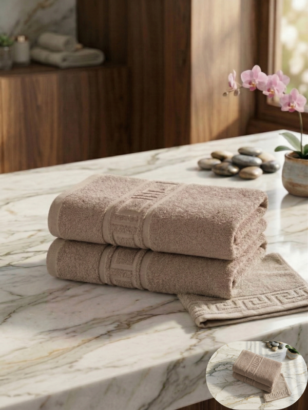Set de 2 prosoape de baie premium din bumbac turcesc 100%, marca Truva Home. Dimensiuni 70×140 cm, densitate 500 g/mp și design elegant cu bordură grecească. Ideale pentru uz casnic sau industria Horeca.